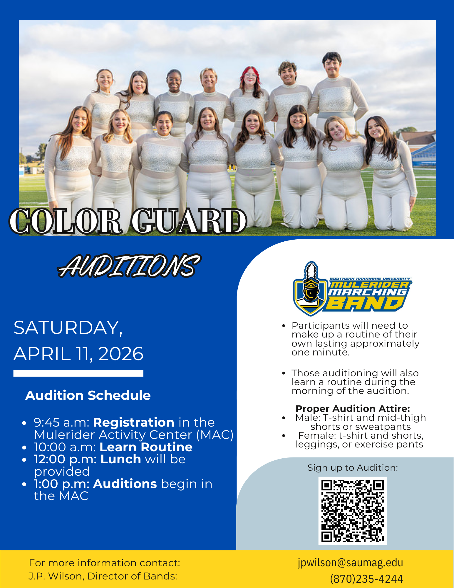 Auditions are open to any SAU student enrolled the Fall semester 2026. Scholarships are offered to SAU Guard members during the Fall semester.