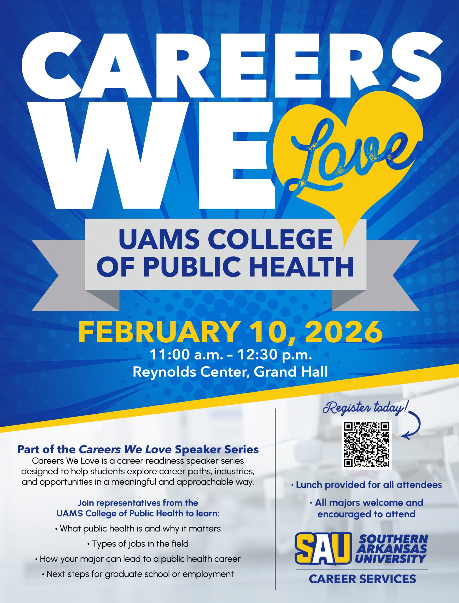 Part of our Careers We Love Guest Speaker Series, this session features the UAMS College of Public Health. They will highlight their academic programs and explore the wide range of career paths available in the public health field.