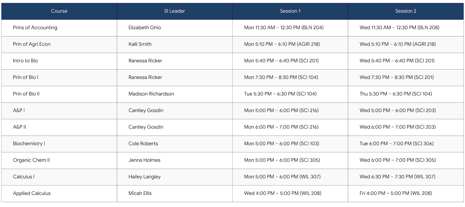 Spring 2025 SI Session Schedule